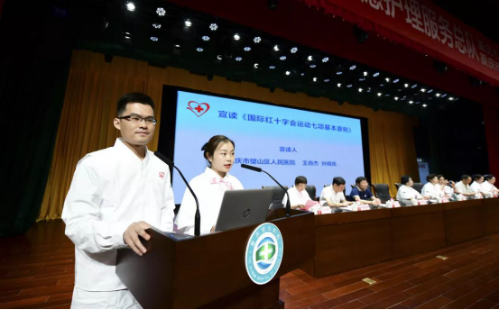 重慶市璧山區人民醫院護理志愿者代表王尚杰、孫曉嵐宣讀《國際紅十字運動七項基本原則》。