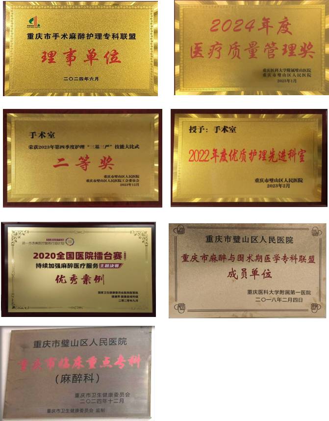 科室榮譽:我科是重慶市臨床重點專科、手術室麻醉護理??坡撁死硎聠挝?、璧山區麻醉質控中心。獲得全國醫院擂臺賽持續加強醫療服務主題決賽“優秀案例”獎;武漢“抗疫之星”及“最美逆行者”;重慶市精準麻醉病例演講比賽“二等獎”;重慶市麻醉護理專委會創新案例大賽“二等獎”;2024年醫療質量管理獎等多項榮譽稱號。