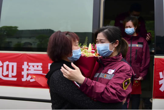 在市民和醫(yī)護(hù)人員的夾道迎接下,隊長劉碧翠高舉凱旋的旗幟,踏著勝利的步伐,朝著家的方向前進(jìn)。