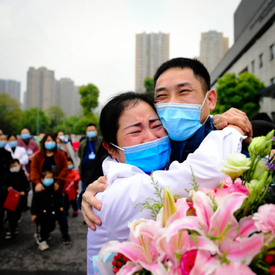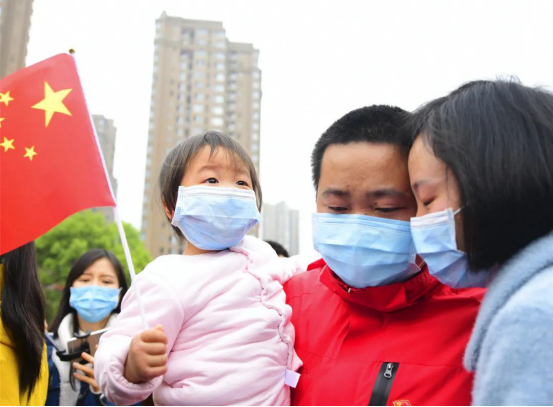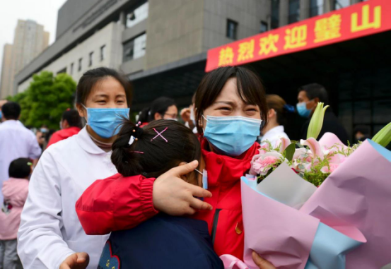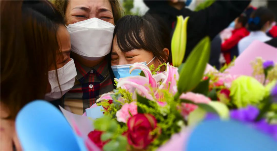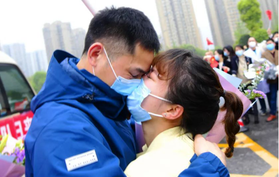 當(dāng)車門打開的一瞬間,所有人齊聲高呼:“抗疫英雄,歡迎回家!"家屬、同事一擁而上,動人畫面中流淌出的,是喜悅、是感動、是希望,是時隔70天的深情一吻,是稚嫩女兒的破涕為笑,是母女相擁的熱淚盈眶……