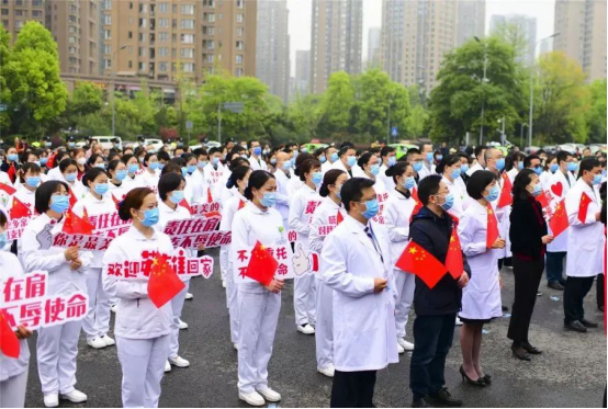 儀式上,隊長陳飛匯報在湖北孝感的工作情況,表示今后將在自己的工作崗位上時刻踐行“敬佑生命、救死扶傷、甘于奉獻(xiàn)、大愛無疆”的醫(yī)者使命,把人民群眾的生命健康放在首位,關(guān)鍵時刻沖得上去、危難關(guān)頭豁得出來,召之即來,來之能戰(zhàn),戰(zhàn)之必勝。