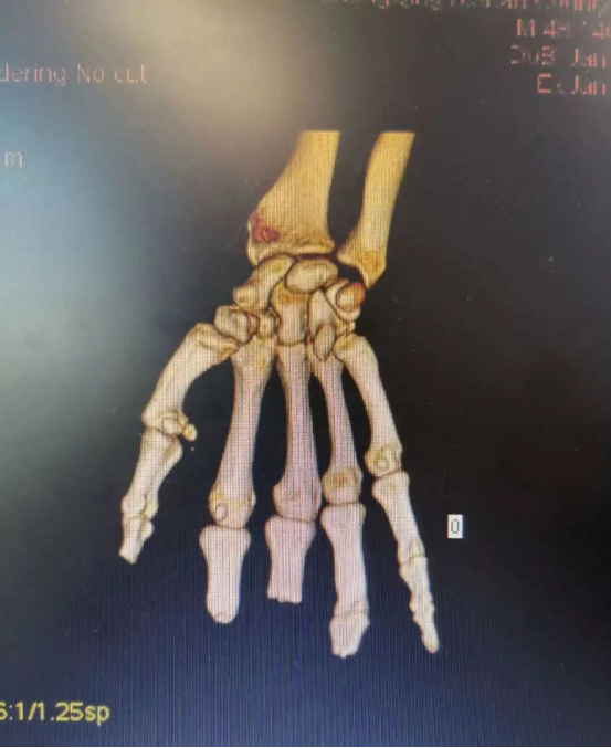 在放射科的支持下,醫(yī)院對患者雙手進行了CT三維重建,通過技術處理,虛擬出了患者缺失的手指,再使用新型材料打印出3D模型,模擬患者的斷指。通過對3D模型進行設計取樣,對患者右拇指、中指精準再造。