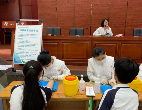 活動(dòng)現(xiàn)場(chǎng),醫(yī)護(hù)人員通過(guò)知識(shí)講座、發(fā)放資料、現(xiàn)場(chǎng)互動(dòng)等多種形式,讓學(xué)生們深入了解關(guān)于結(jié)核病和艾滋病的致病原理、發(fā)病狀況、傳播途徑、防治措施等。用生動(dòng)的事例、大量的數(shù)據(jù),讓同學(xué)們懂得防治肺結(jié)核和艾滋病的重要性,筑起結(jié)核病和艾滋病防護(hù)墻。活動(dòng)最后,感染科醫(yī)護(hù)人員還為同學(xué)們進(jìn)行了結(jié)核菌素試驗(yàn)(PPD)篩查。