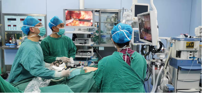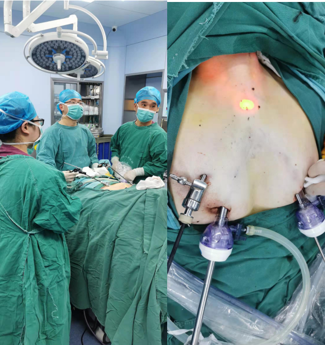 (甲狀腺外科覃勇主治醫(yī)師、彭祿榮主任醫(yī)師在經(jīng)胸前入路腔鏡甲狀腺手術(shù)中)