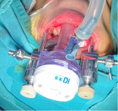 傳統開放手術會在頸部留下5厘米左右的疤痕,考慮到患者提出的“術后不留下明顯疤痕”的希望和要求,甲狀腺外科覃勇、彭祿榮醫師經過術前充分討論,決定采用經口腔前庭入路腔鏡甲狀腺手術術中僅于口腔前庭粘膜切開1個1.5cm、2個0.5cm小切口,并通過腔鏡完成手術。