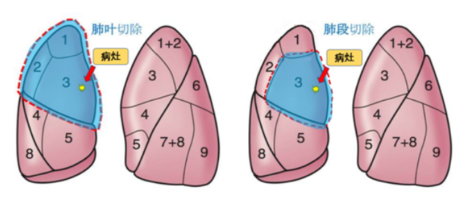 每個肺葉由若干肺段組成(肺段又由若干亞段組成)。肺段在解剖學上是一個完整和獨立的肺單位,呈圓錐形,尖端朝向肺門,底朝向肺表面,每一肺段除有肺組織外,還有相應的支氣管和動、靜脈相伴而行,正常人共有19個肺段。肺段切除就是把肺葉保留下來,將病變所在肺段切除的技術。如圖病變長在右上肺葉前段,我們僅需切除右上肺前段,保留尖段和后段,相當于保留了右上肺三分之二的功能。