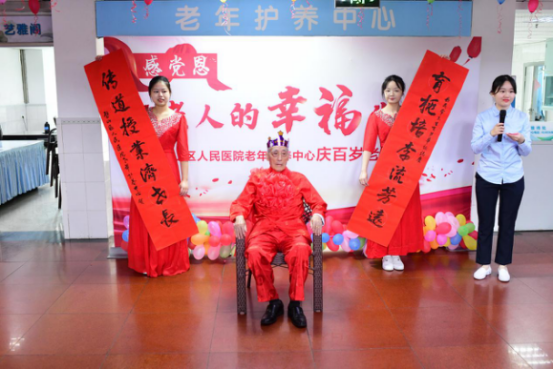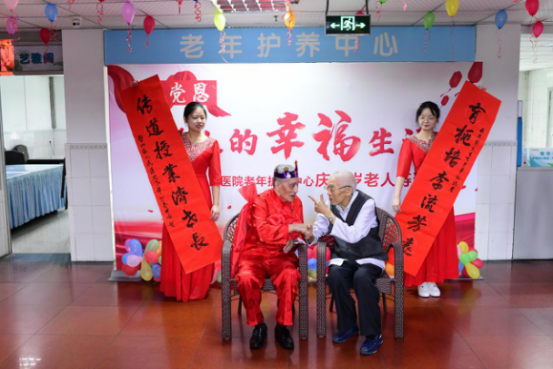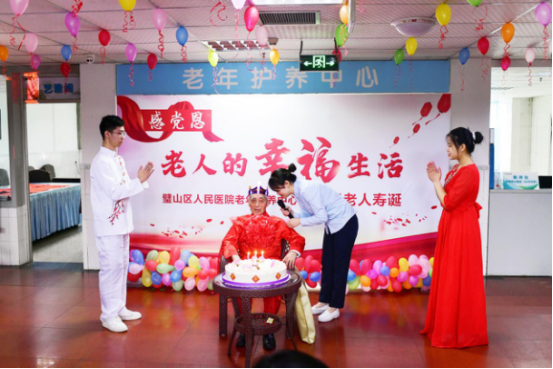 “一年有365個日出,我送你365個祝?!痹谥貞c市璧山區(qū)人民醫(yī)院老年護(hù)養(yǎng)中心傳來了歡快嘹亮的歌聲,這是一位百歲老人的生日現(xiàn)場。院黨委書記劉鴻、副院長郭進(jìn)軍(主持行政工作)、副院長彭彩碧攜護(hù)養(yǎng)中心的“醫(yī)護(hù)兒女”為冉茂常爺爺送上了蛋糕、鮮花與祝福,并齊唱起了《365個祝?!?。