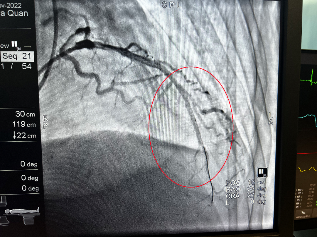 王大爺的胸痛癥狀持續不緩解,完善心電圖后提示急性ST段抬高型心肌梗死。“時間就是心肌、時間就是生命。”我院胸痛中心立即為王大爺啟動胸痛救治綠色通道,雖然患者核酸結果未出,但心血管內科醫護人員在做好防護的前提下,仍然為患者開展了緊急介入手術。