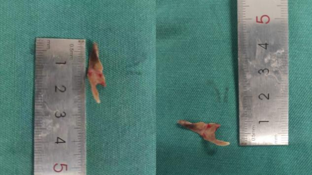 經(jīng)過綜合評(píng)估、完善相關(guān)檢查、排除手術(shù)禁忌后,呼吸與危重癥醫(yī)學(xué)科譚繼玲副主任醫(yī)師、王開金副主任醫(yī)師帶領(lǐng)介入團(tuán)隊(duì)為患者實(shí)施了“軟硬鏡結(jié)合下異物取出術(shù)”。術(shù)中可見患者左主支氣管開口大部阻塞,此“異物”質(zhì)硬類似骨質(zhì)。由于異物較大,且嵌頓于左主支氣管,異物周圍支氣管肉芽組織增生,這種手術(shù)大出血的風(fēng)險(xiǎn)極大,隨時(shí)做好搶救出血的準(zhǔn)備,最終憑借嫻熟的技術(shù),成功將卡在左主支氣管的異物取出(異物為骨頭,邊緣銳利,大小26mmx10mm)。取出異物后,王開金副主任醫(yī)師認(rèn)為患者粘膜異常,不排除合并腫瘤,因此同步行活檢,最終病理結(jié)果確診為鱗癌。
