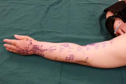 淋巴水腫的手術治療包括非生理性手術及生理性手術。非生理性手術創傷大、風險高,并發癥相對較多。李大姐兩年前發現乳腺癌,先后做了四次大手術,近期檢查又發現腫瘤復發,不適合采用非生理性手術。根據患者實際情況,手足外科專科技術團隊組織討論,確定開展左上肢淋巴水腫超顯微外科手術重建淋巴回流通道,從根本上改善病情。手術由我院手足外科胡明興副主任主刀,丁一主治醫生配合,順利完成。