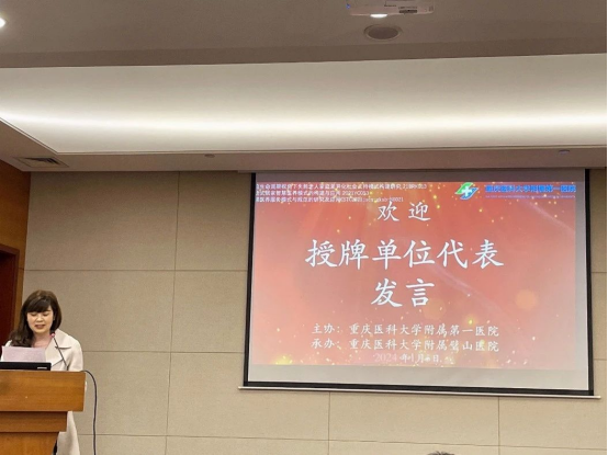 授牌儀式在激情洋溢的音樂中進(jìn)行,我院郭進(jìn)軍院長及謝莉玲教授向附一院青杠護(hù)養(yǎng)中心、我院科教部、璧泉街道衛(wèi)生服務(wù)中心護(hù)理部等3家基地授牌。我院科教部陳梅主任代表研學(xué)基地接牌,并代表研學(xué)基地發(fā)言,她首先表達(dá)了在新年伊始收到一份“沉甸甸”禮物的激動喜悅之情,向趙慶華教授團(tuán)隊(duì)對我院的厚愛與信任表達(dá)了衷心感謝,并表示此次研學(xué)基地授牌儀式,將進(jìn)一步促進(jìn)重醫(yī)附一院對我院在護(hù)理科研領(lǐng)域的指導(dǎo)與合作,同時將努力把研學(xué)基地建成培養(yǎng)未來護(hù)理專業(yè)人才的重要搖籃。