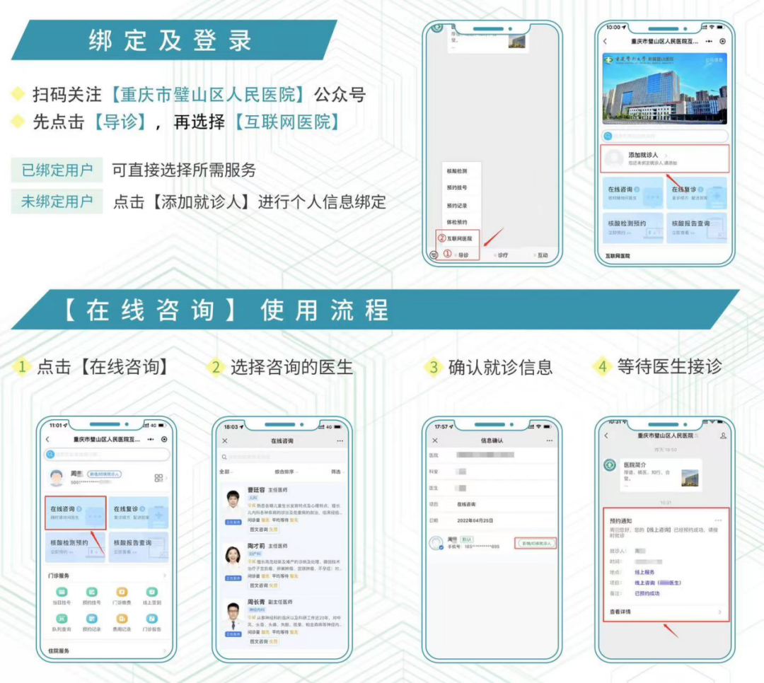 門診所有科室均已恢復正常預約掛號,患者可以關注我院公眾號“重慶市璧山區人民醫院”進行分時段預約,按照預約時間段,錯峰來院就診。