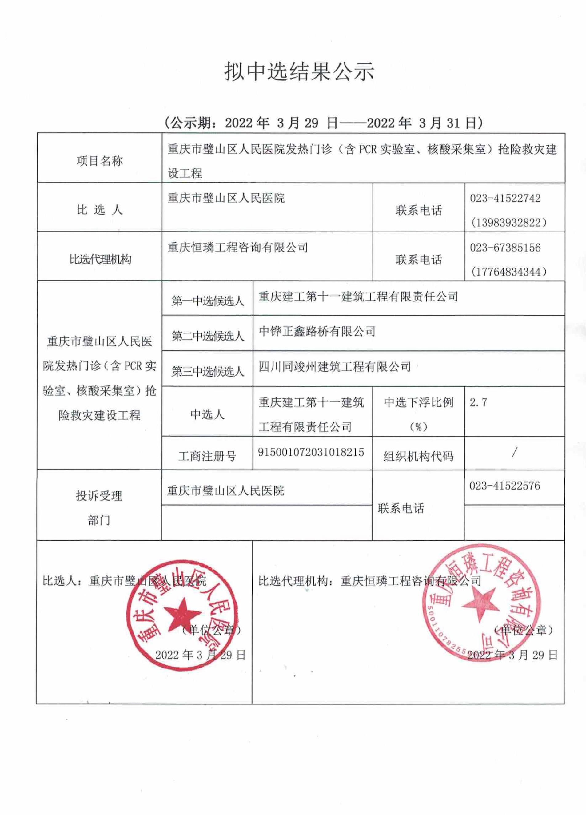 項目名稱: 重慶市璧山區人民醫院室外鋪裝塑膠地板工程 評審日期: 2020年3月17日 10:00 公示日期: 2020年3月17日—3月19日 采購方式: 詢價采購 采購人名稱: 重慶市璧山區人民醫院 采購人地址: 重慶市璧山區璧泉街道雙星大道9號 項目負責人: 張老師 聯系電話: (023)41522742 擬成交供應商排名: 第一中標候選人:重慶市昶嶸建筑工程有限公司 中標金額:57375元 第二中標候選人:重慶市國華建筑工程有限公司 第三中標候選人:重慶市璧山區興新建筑工程有限責任公司 備注: 公示期為3天